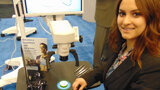 Kelly Payan of Seiler shows off the company’s Promise Vision 3D surgical microscope. (Photo: Fred Michmershuizen/Dental Tribune America)